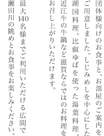 最大140名様までご利用いただける広間と当館1階レストランから瀬田川を眺めながらお食事をしていただけます。また椅子に掛けてお料理を召し上がって頂くこともできますので、ご年配の方や足の不自由な方でもご安心してお食事いただけます。
